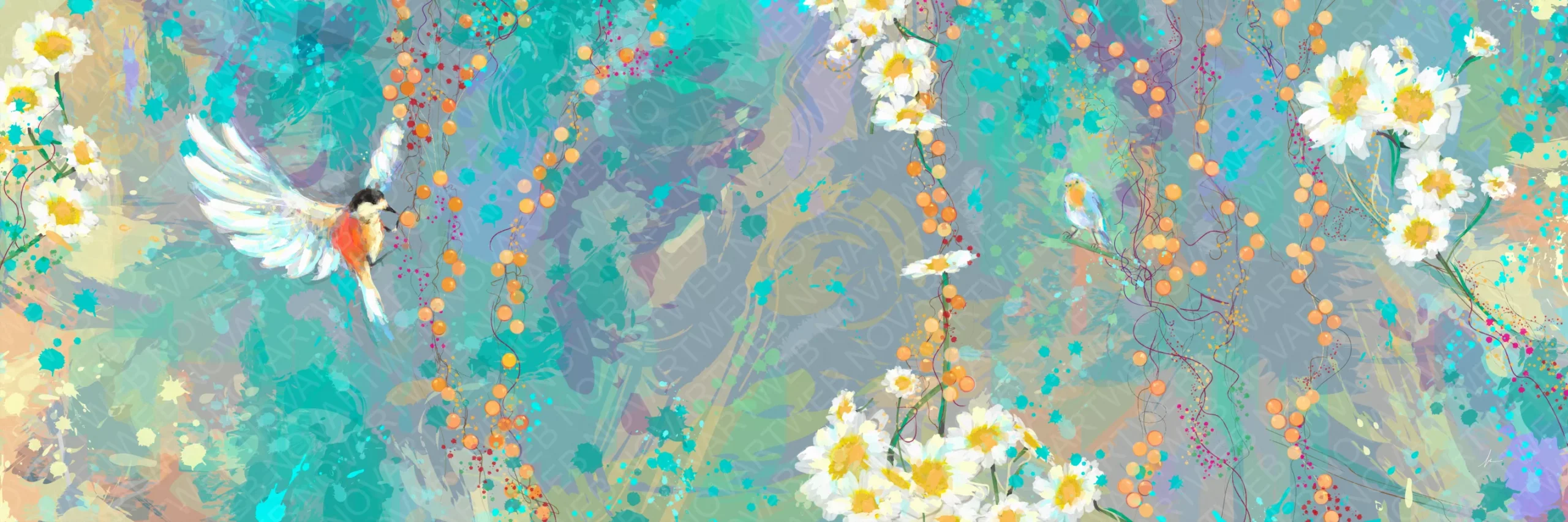 “ALETEO” visualiza un ave detenida en el instante exacto en que sus alas sostienen todo el peso del aire, como si el mundo quedara suspendido de ese gesto. El movimiento del pájaro se funde con la atmósfera que lo rodea: flores flotantes, líneas doradas y manchas de color siguen el mismo pulso, formando un entorno que late al ritmo de ese batir suave. Además, nada cae ni se fija del todo; cada elemento parece depender de ese vuelo contenido, creando una escena donde la ligereza no es ausencia de fuerza, sino una forma delicada de equilibrio.